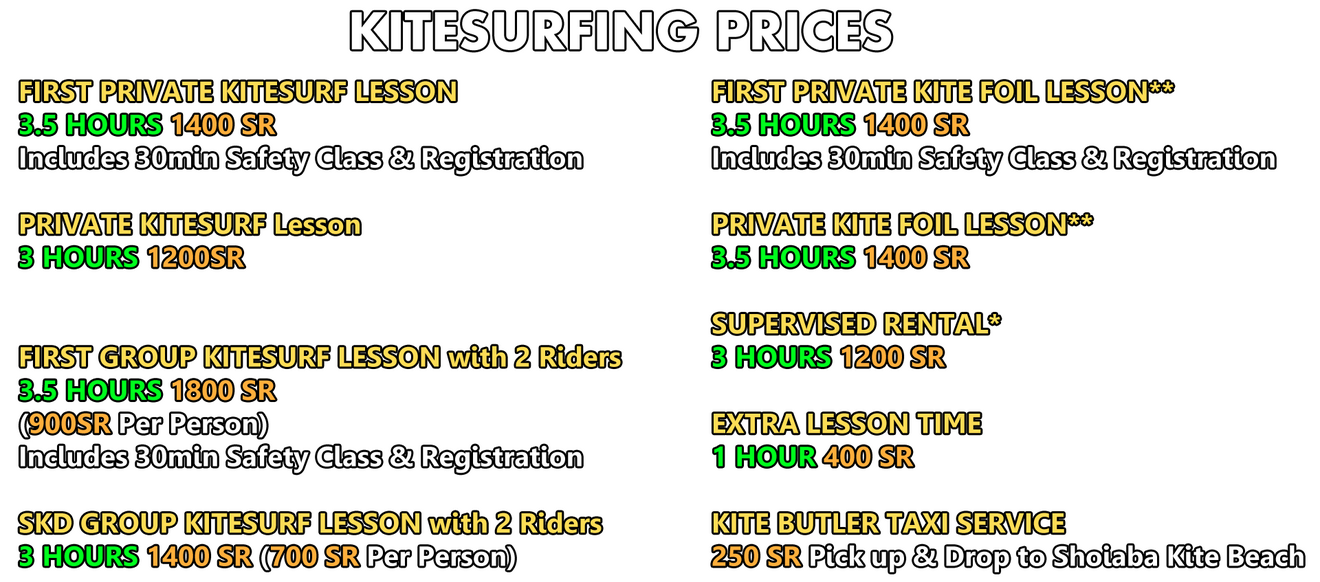 If it's your first Kitesurf lesson or rental, you must register and complete the 1-hour Beach Safety Classroom lecture held in Jeddah City Center Sports Hall. This class introduces you to the equipment, the dangers and theory of kiteboarding. You will watch kite safety video and specially edited and designed for KiteSurfing in Jeddah. I will familiarise you with the essential safety systems and how they work so you will be fully prepared to get straight into the water and face the elements with confidence and stamina. All lessons include a 30 min break. Kids under 16 must be accompanied by an adult.